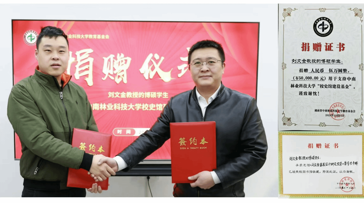 活动期间,刘文金教授的家属和研究生校友共同决定将《文集》捐赠学校图书馆,并将首发售书款及其他捐款共计5万元整捐赠给中南林业科技大学教育基金会支持学校校史馆建设,以实际行动为母校建设添砖加瓦。