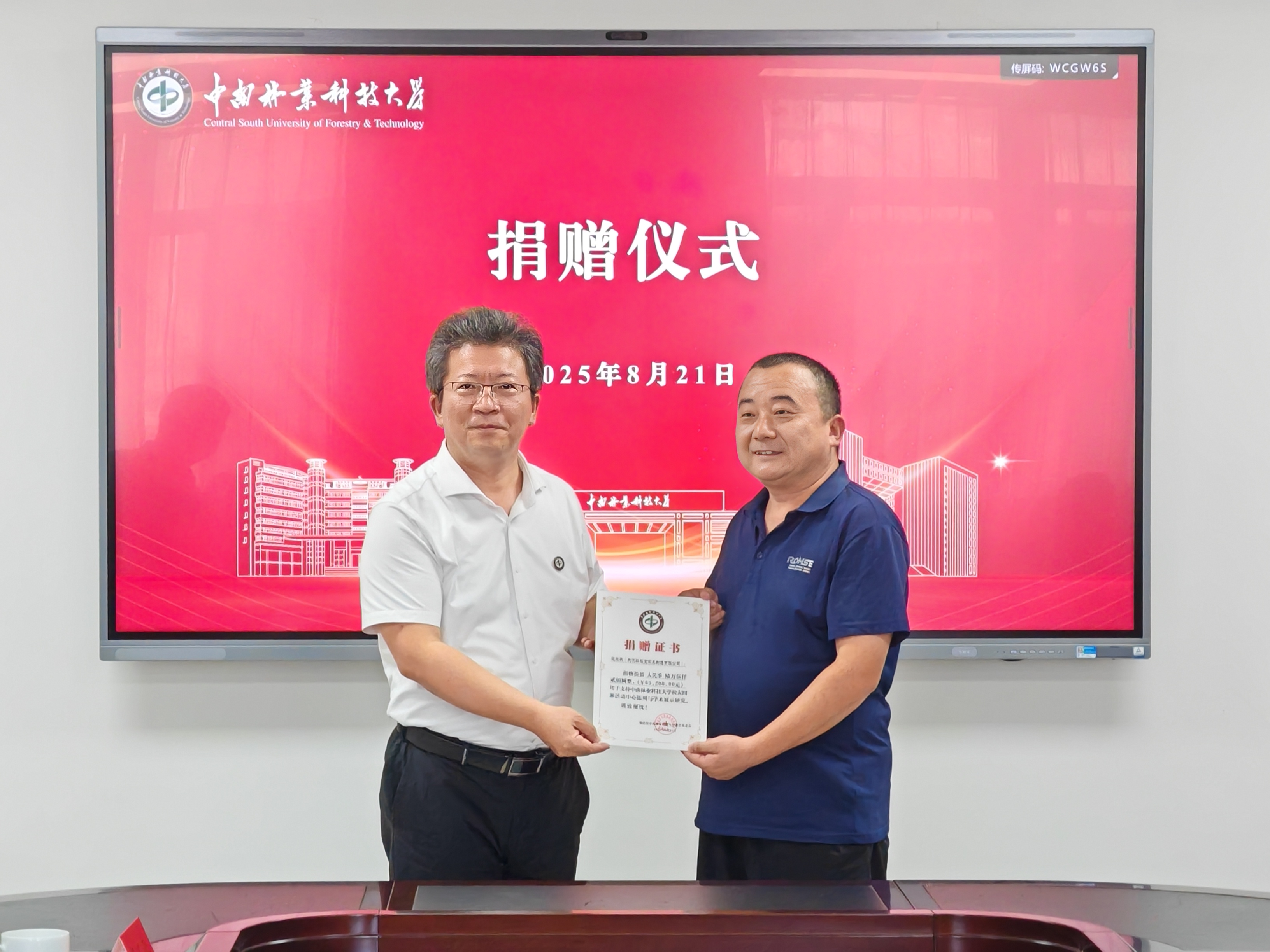 捐赠仪式环节,学校教育基金会秘书长严爱军与赵来振共同签署捐赠协议,尹双凤向赵来振颁发捐赠证书。此次捐赠的红木座椅,将用于学校校友回湘活动中心的陈列展示及学术交流活动。
