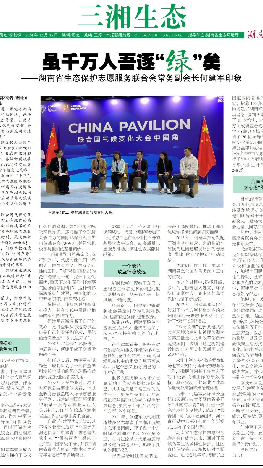 何建军参加的联合国气候变化大会第二十九次缔约方大会(COP29)11月11日至22日在阿塞拜疆首都巴库举行。各缔约国政要和非政府组织(NGO)精英欢聚一堂,共商应对气候变化策略。来自中国湖南的“平民”湖南省生态保护志愿服务联合会常务副会长何建军也受邀参会,并向全世界发布湖南民间环保组织对于应对世界气候变化曾经提供和将要提供的解决方案。受邀联合国气候变化大会,是政府对社会组织的高度认可,是社会对他的广泛认同,是何建军18年的环保志愿服务事业的高光时刻,更是他孜孜以求的逐“绿”行新的加油点。