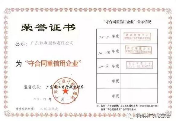 如春园林拥有《城市园林绿化企业》壹级资质,《风景园林工程设计》甲级资质,《林业调查规划设计》乙级资质,《造林工程规划设计》乙级资质,《造林工程施工》乙级资质,《旅游规划设计》丙级资质。在业内率先通过国际质量管理体系、环境管理体系、职业健康管理体系等安全体系认证,作为AAAAA级信用企业,连续10年被评为广东省守合同重信用企业。