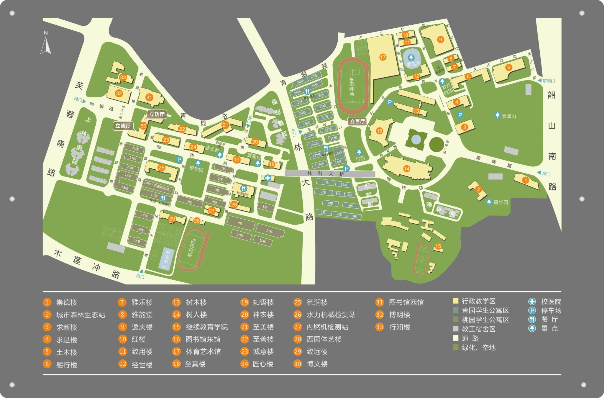 学校校园占地面积1388亩,拥有一个占地面积达7万余亩的国家级森林公园。校舍建筑总面积70.3万平方米,固定资产总值17.8亿余元,教学科研设备总值3.89亿余元,图书馆藏书303万余册。学校为全国绿化模范单位和全国首批建筑节能示范高校,校园环境优雅,绿树成荫,学校绿化覆盖率达60%以上,拥有植物1100多种,是国际植物园保护联盟单位。